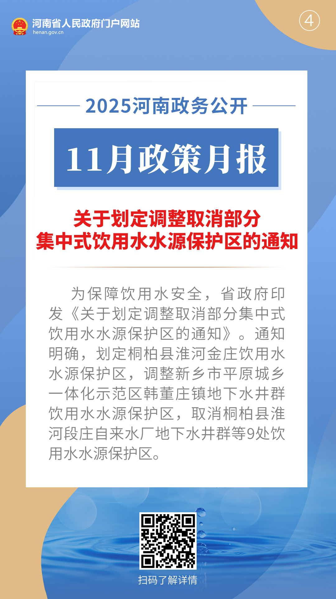 2025年11月,河南省人民政府出台多项重要政策,包括河南省地名管理办法、中国(新乡)跨境电子商务综合试验区实施方案、关于调整河南省最低工资标准的通知、关于划定调整取消部分集中式饮用水水源保护区的通知。通过河南政务公开11月政策月报,一起来看详情——